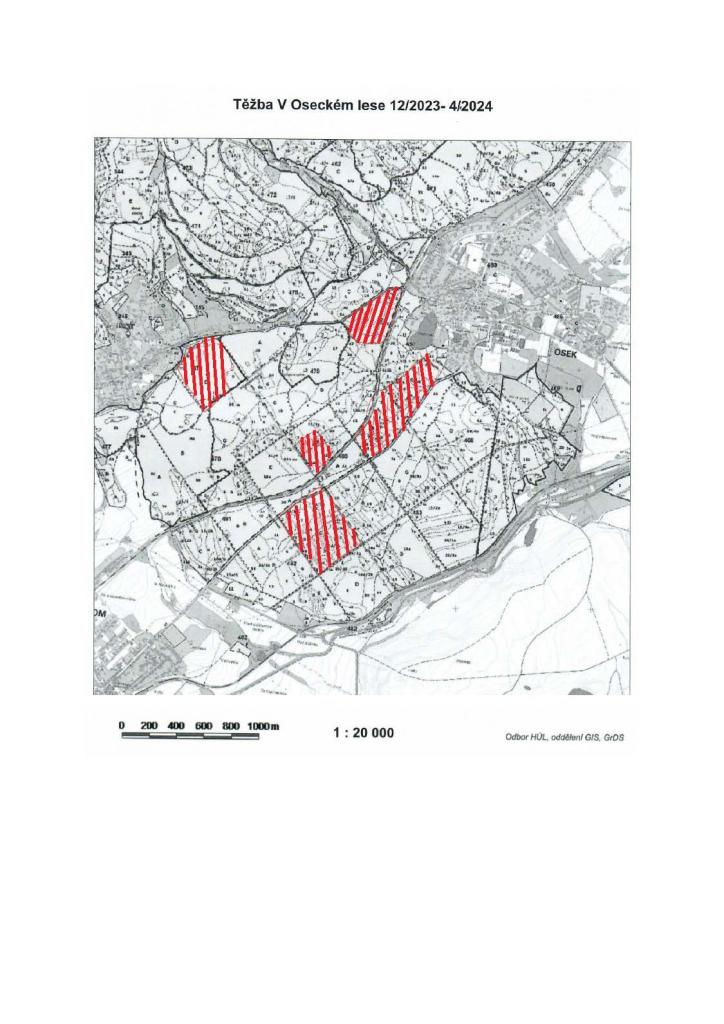 Těžba bude probíhat v zimním období 2023 – 2024 zejména v Oseckém lese a části Dubiny. Z bezpečnostních důvodů je nezbytné dodržovat zákaz vstupu do míst, která jsou červeně vyznačena v přiložené mapě a v terénu označena informačními cedulemi o zákazu vstupu. Žádáme všechny občany, aby ve vlastním zájmu po dobu těžby respektovali toto omezení.