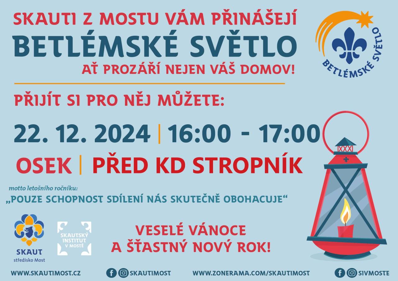 Skauti z Mostu vám opět přinesou Betlémské světlo. Tentokrát před KD Stropník.