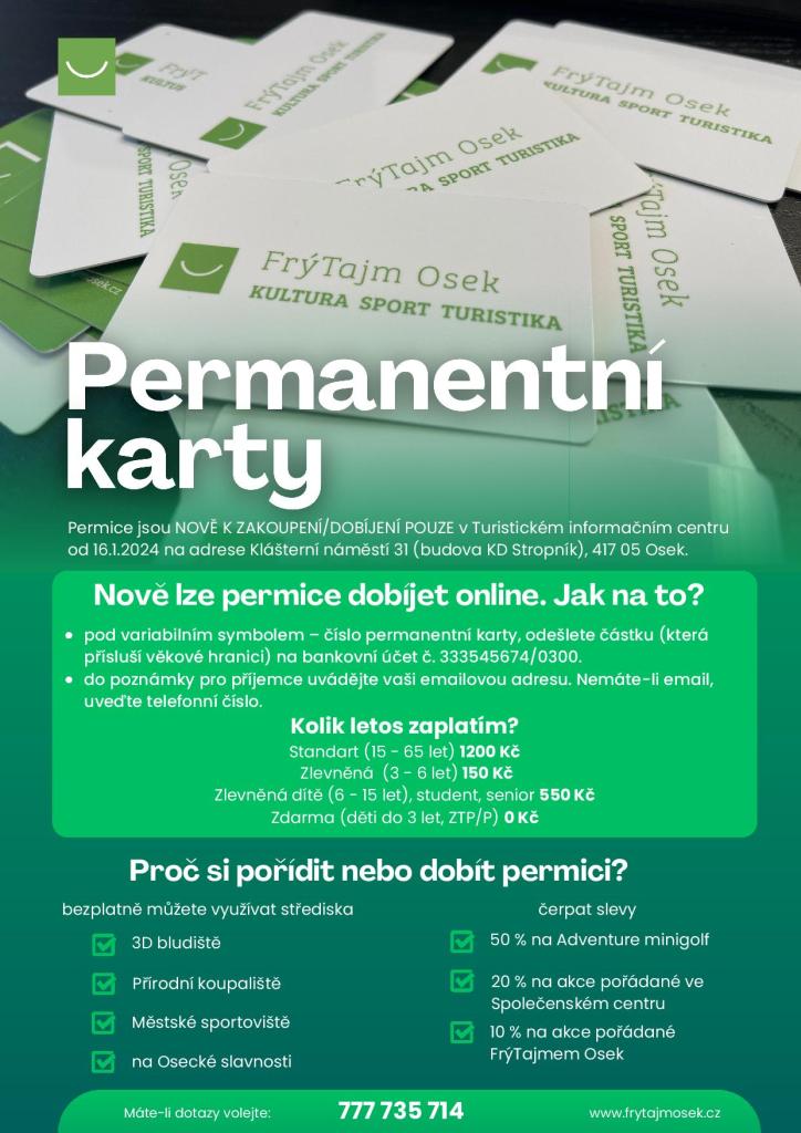 Permanentní karty FrýTajm Osek pro rok 2024 zakoupíte v novém TIC Osek, Klášterní náměstí 31. Využijte zvýhodněné vstupné na kulturní, sportovní a městské akce po celý rok.